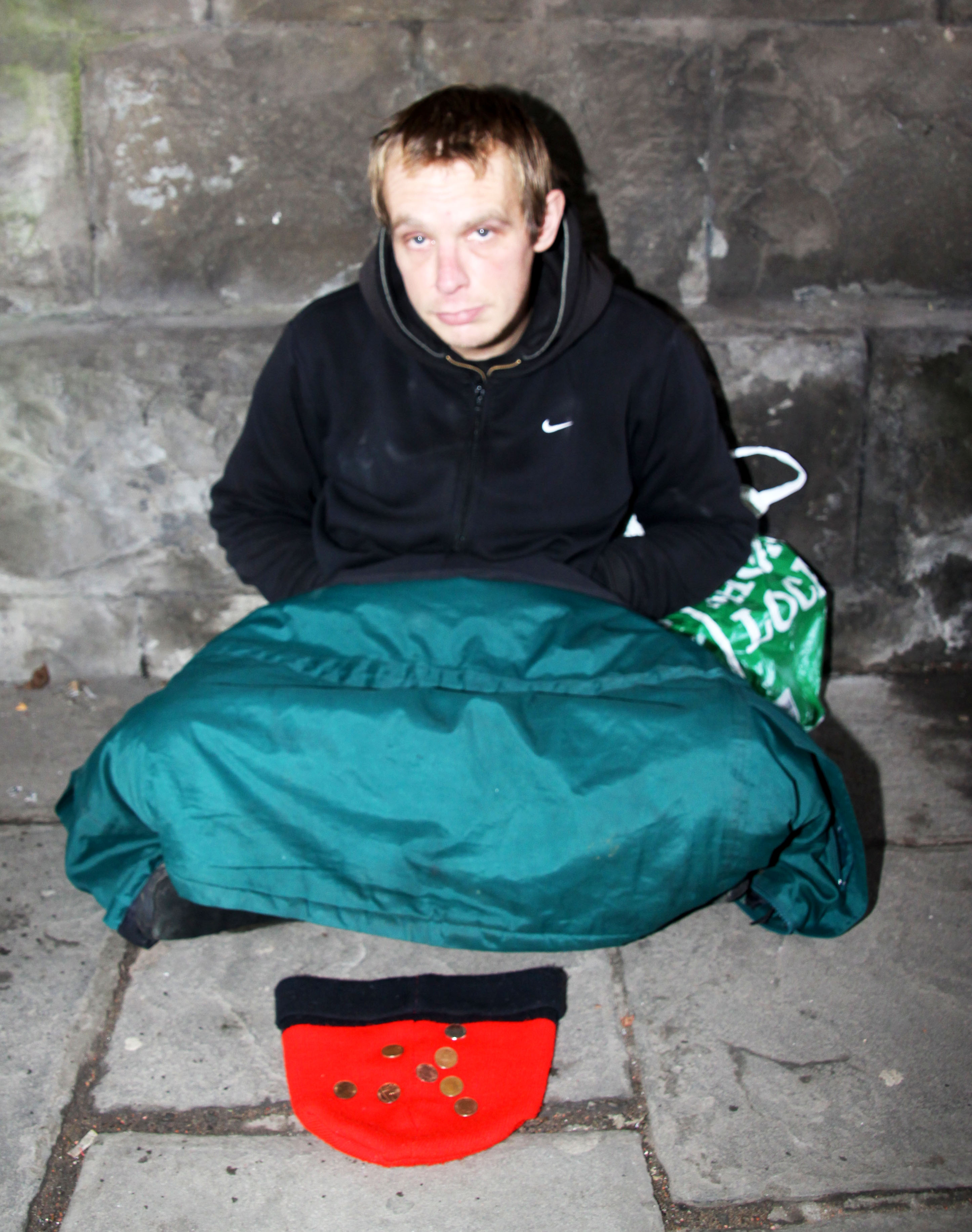Warren Dutson, 36, sits under a railway bridge in Cardiff just up the road from the University of South Wales Atrium campus. He is unemployed and homeless. It is a cold damp dark depressing place. I hope to find out more about him and to see if there is some way he could be helped.