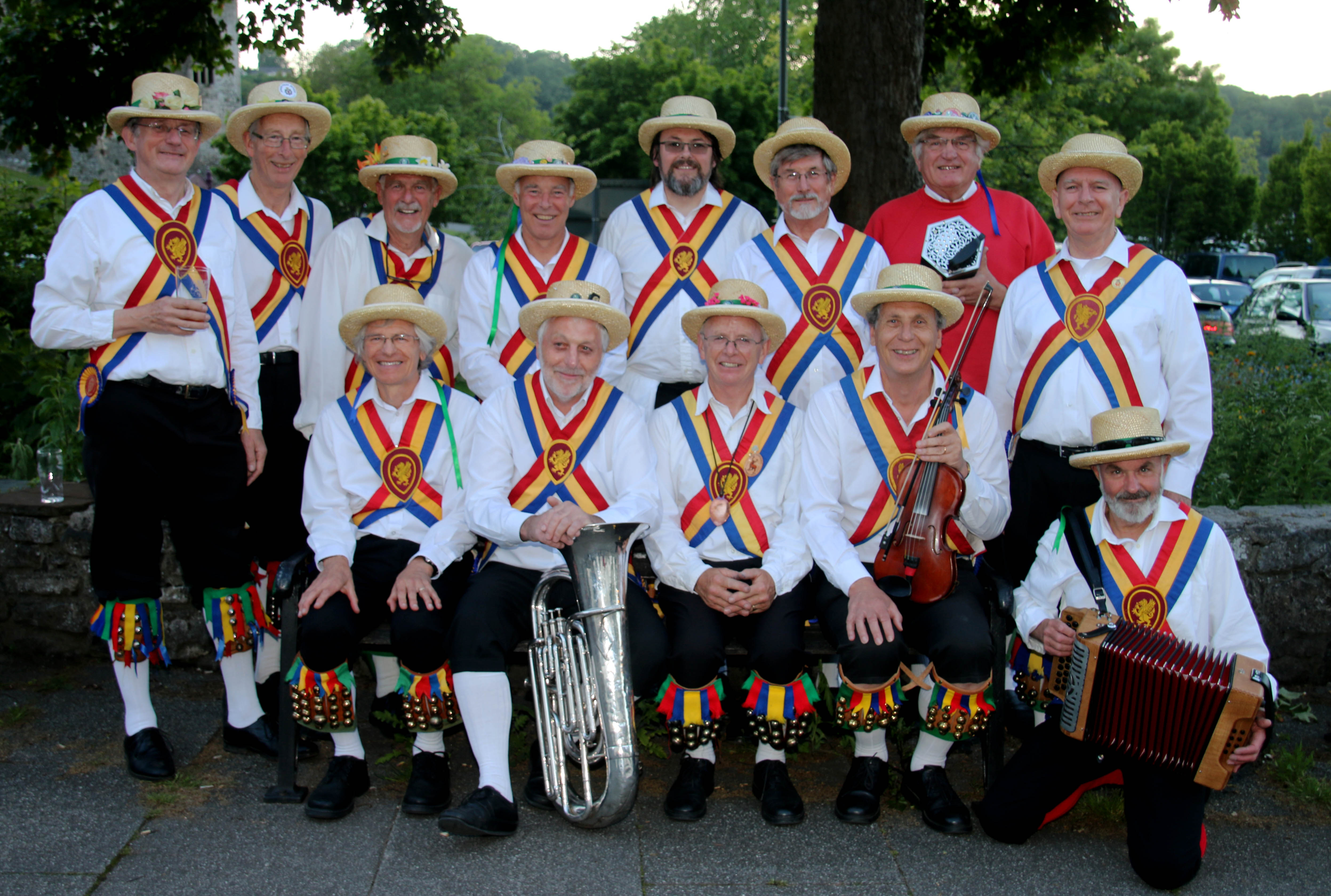 The Mendip Morris Men have been performing the traditional dances of the Cotswolds throughout the North Somerset area since their formation in 1956. There is a wide variety of instruments seen and heard when they perform because music is a vital element in morris dancing. There is the traditional pipe and tabor (whistle and drum) fiddle, concertina, melodeon, piano accordion and a mellow tuba. The Mendip Morris Men can be identified by their red, gold and blue baldrics (crossed sashes), adorned with King Alfred’s jewel at the back and the Somerset dragon at the front. Black breeches and gaily decorated straw hats complete the outfit.
