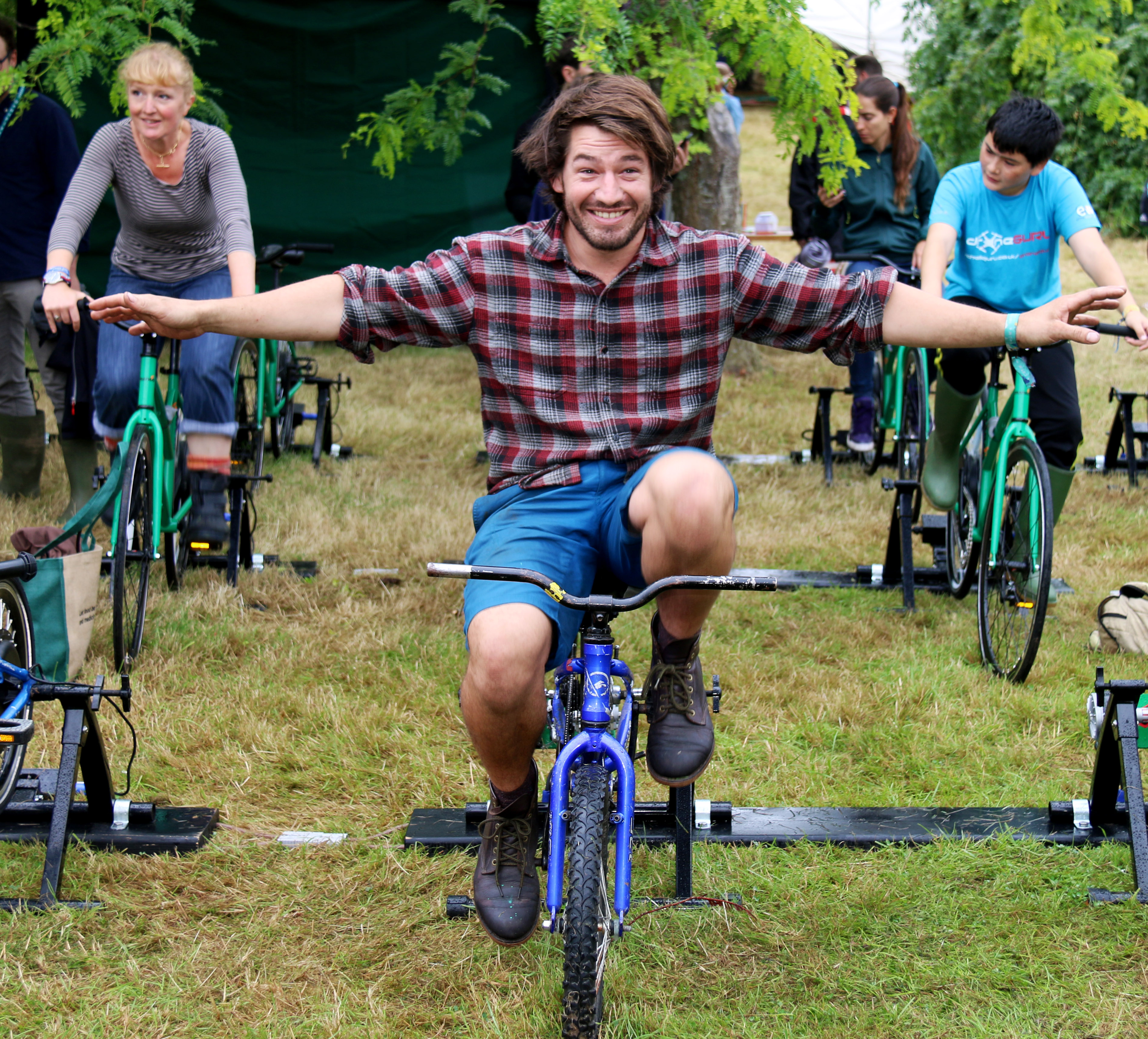Helping everyone stay in touch in an environmentally friendly way by charging their phone batteries by means of pedal power is Richard Warner from London.